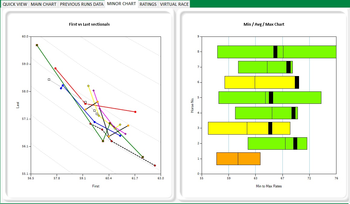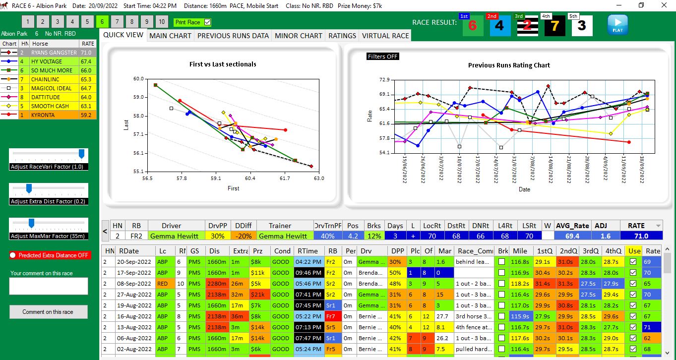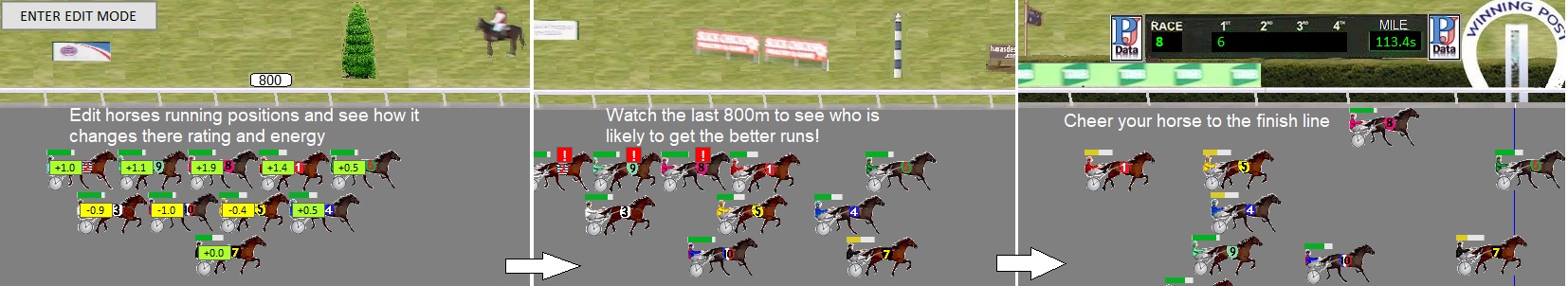 Watch the race to the finish and see how it compares to the ratings. This is not just a toy – It is based on horse sectional speeds, pace and energy used in running using previous run information. This can provide significant information that you can’t get from ratings alone. Go back to the 800m, edit positions and see how it changes the predicted outcome with a simple drag / drop. Ratings adjust based on your positioning.