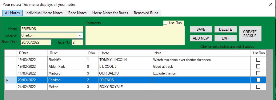 Add you notes to any race or horse and these will be available in future meetings with your own personal database.