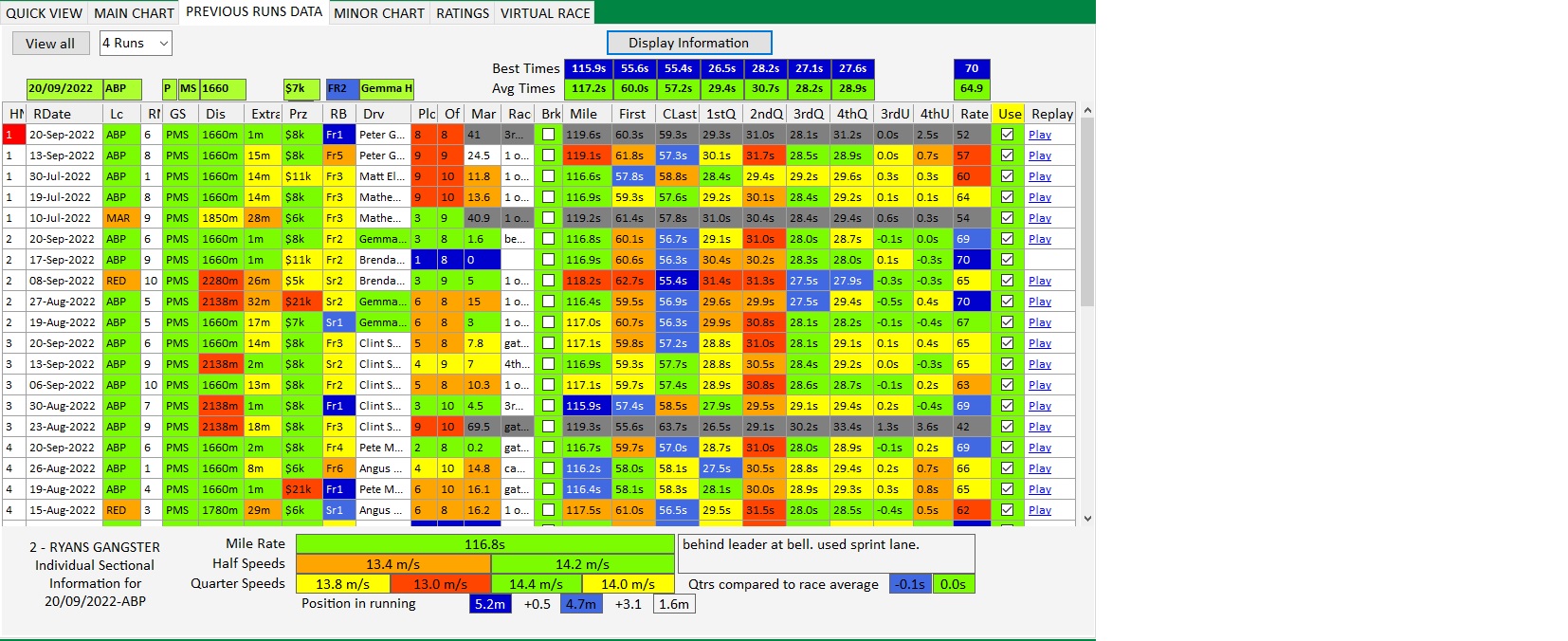 View all the horse’s previous runs. Below is the sectional data view where you can see a colour-coded breakup of each previous run and detailed individual sectional information. Look at individual horse information or compare them against each other.
