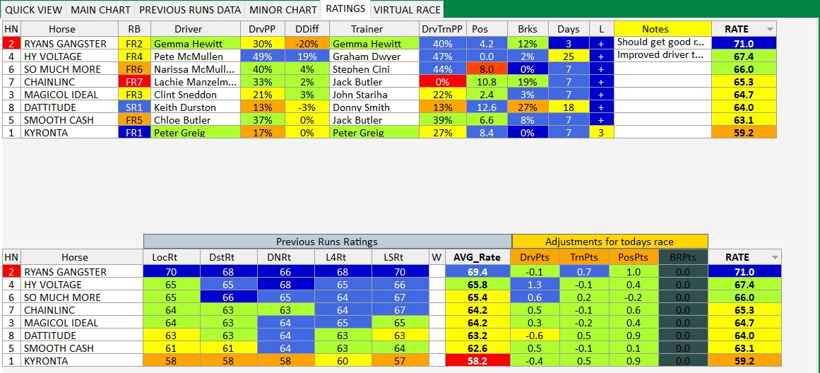 The ratings tab allows you see how the ratings are formed for each horse and how much your adjustments are changing the average ratings. Change the setting for all or any race. Make your notes on each horse that will then appear in your reports.